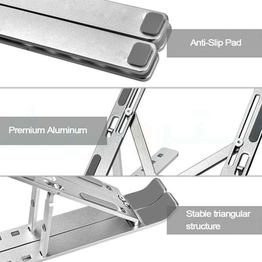 حامل لاب توب قابل للتعديل مصنوع من الألمنيوم عالي الجودة، مزود بسطح مانع للانزلاق وزوايا قابلة للتعديل لتوفير راحة أثناء العمل على المكتب مع تصميم مستقر وثلاثي الأضلاع.